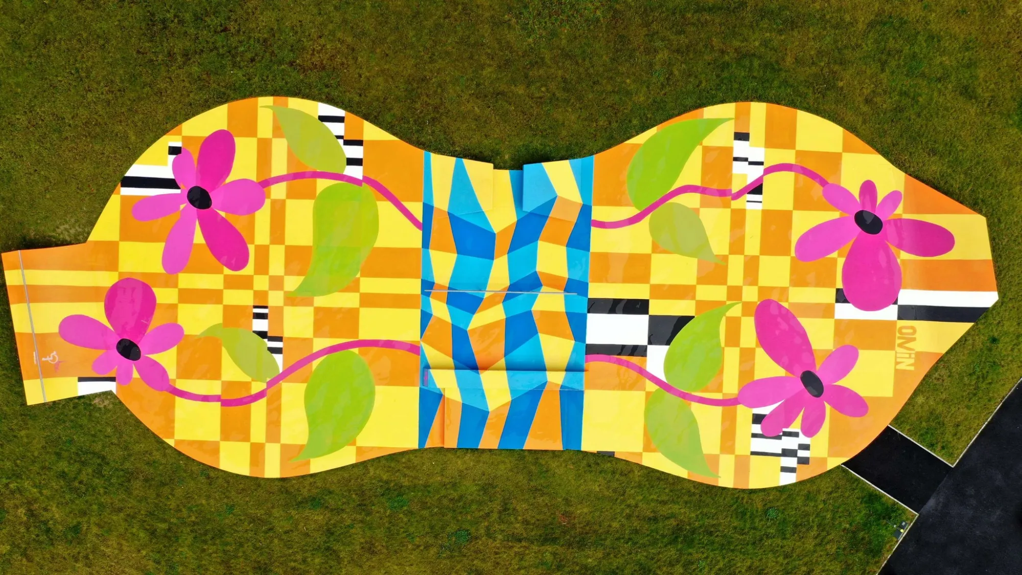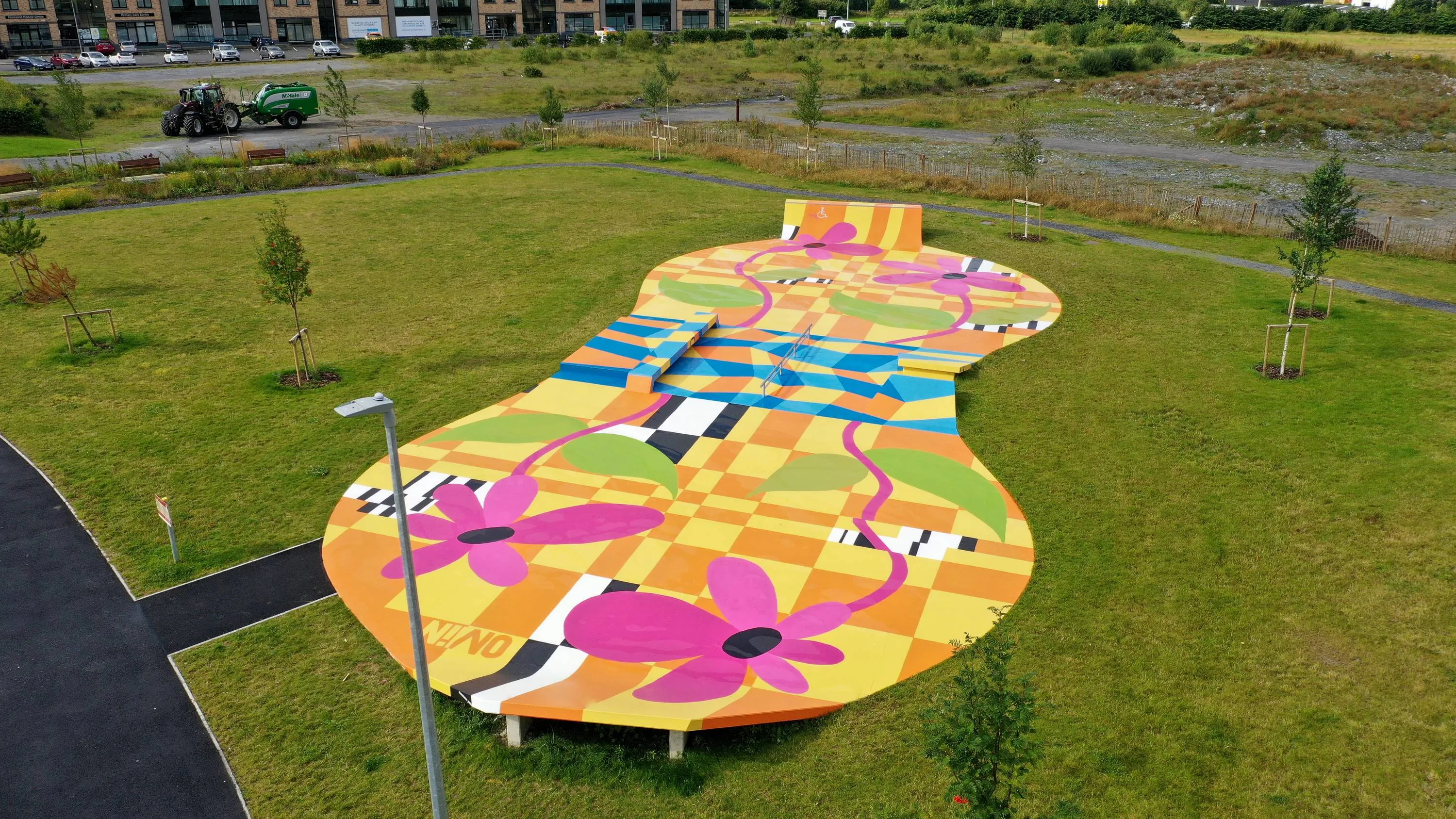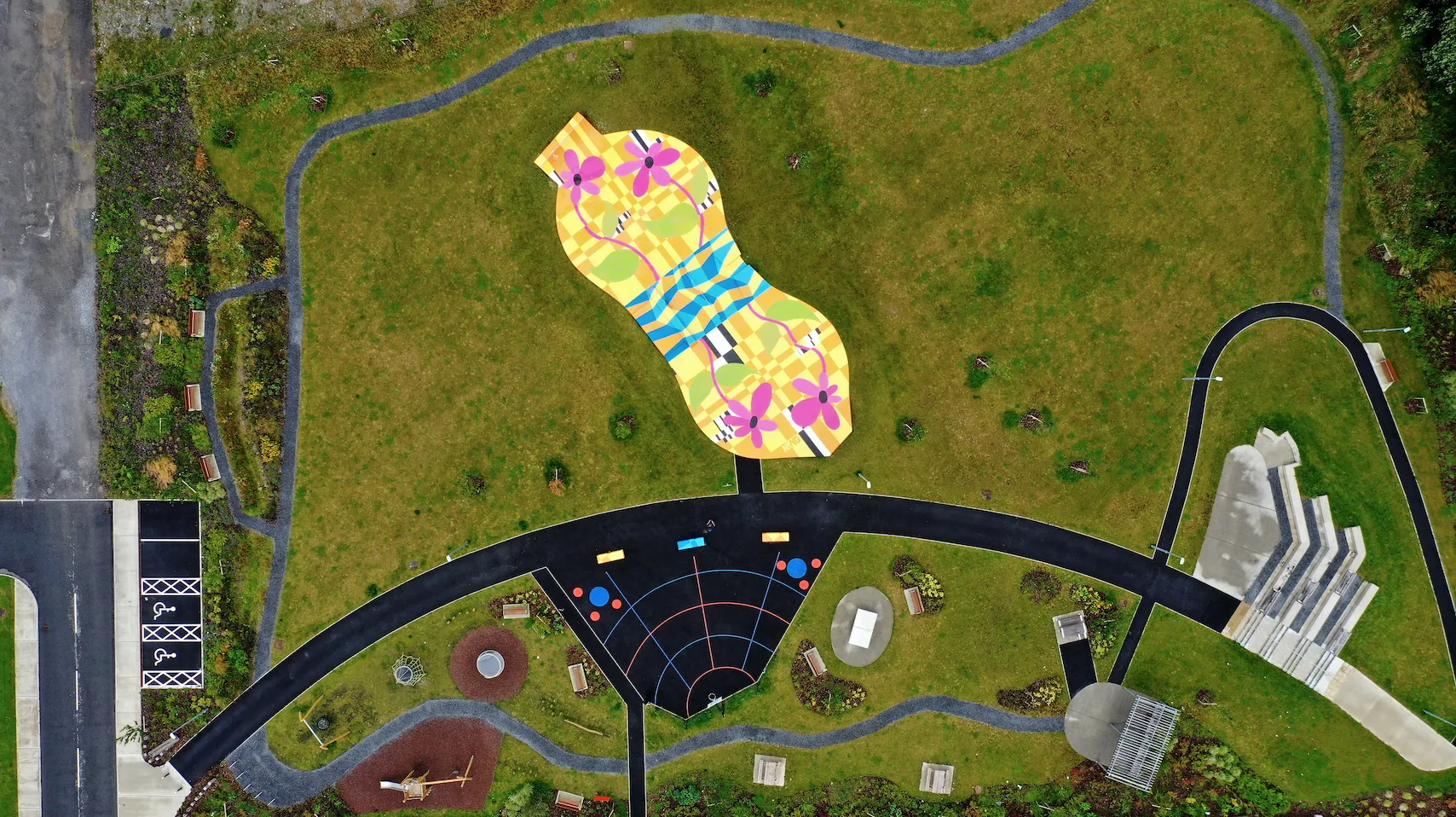Since the River Shannon runs right along the border, we decided to make it the central inspiration for the design. The river flows through the middle of the artwork - right across the obstacles at the heart of the park - with floral elements branching outward on either side. These organic forms are layered over the Fibonacci sequence, a mathematical pattern that underpins so much of nature’s design.